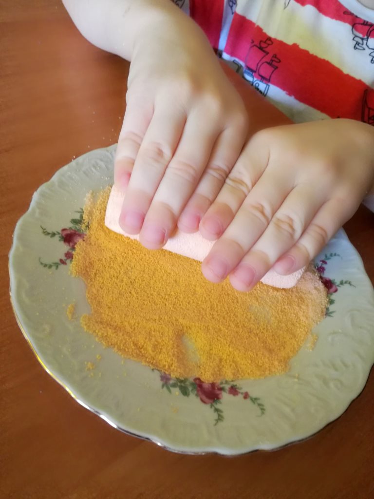 Pocierając kredą, kulając ją i przesuwając w różne strony po rozsypanej soli sprawicie, że sól stopniowo przyjmie kolor ścieranej kredy: