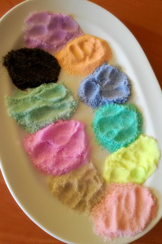 Jeśli w domu nie posiadacie kolorowej kredy, sól możecie zabarwić mazakami, farbami (najlepiej w tubkach), bibułą lub gotowymi barwnikami. Do dzieła!