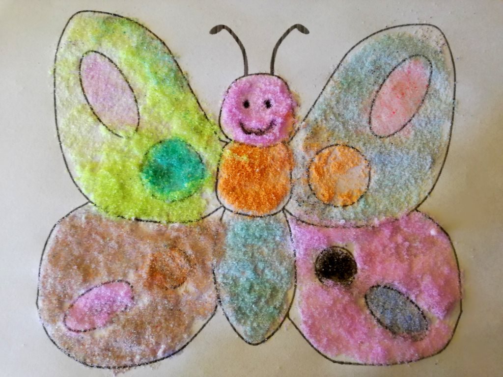 Poszczególne części skrzydeł motyla smarujemy klejem typu wikol lub magic i posypujemy wybranym kolorem soli i tak tworzymy kolorowy rysunek. A jak uzyskać sól w różnych barwach? Już wyjaśniamy! Potrzebne Wam będą: