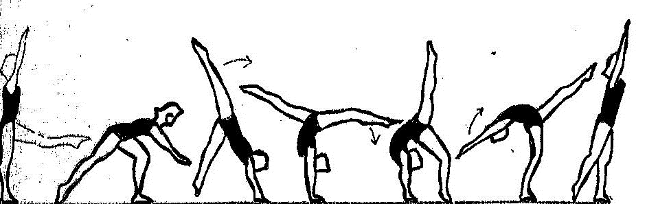 Wykonanie: Z postawy wznos ramion w górę przód i nogi w przód . Wykrok w przód na ugiętą nogę i pochyleniem się w przód oprzeć proste ręce na podłożu . Odbiciem jednej i zamachem drugiej nogi stanie na rękach w szpagacie. Nie zatrzymując ruchu i cofając nieznacznie barki w tył opuścić nogę w dół na podłoże. Odepchnięciem się z rąk przenieść ciężar ciała w przód i powstać do postawy z ramionami w górze. W ćwiczeniu w tym  zwracać uwagę na kolejne elementy ruchu: