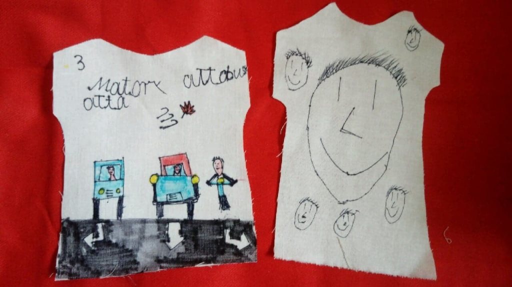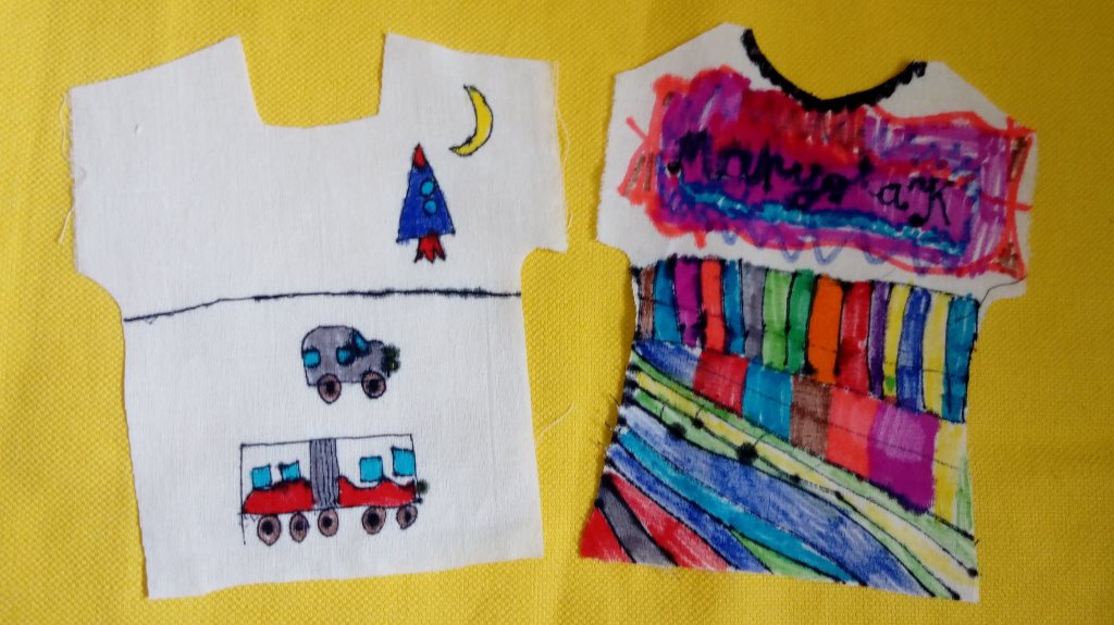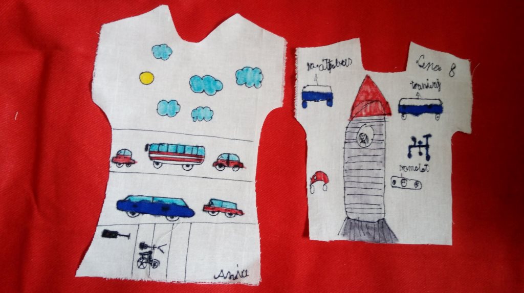 Na razie mini koszulki. Z kawałka białej, bawełnianej tkaniny wytnijcie kształt podobny do bluzeczki, a potem mazakami, cienkopisami lub farbkami stwórzcie na nich ciekawy rysunek, który zostanie przeniesiony na dużą, bawełnianą koszulkę (mam nadzieję wkrótce) podczas naszych najbliższych zajęć w pracowni MDK.