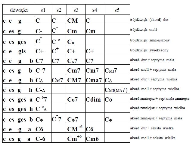 1. Budowanie akordów septymowych, zmniejszonych, zwiększonych oraz ich określanie. Należy także pamiętać o tym, że w zapisie międzynarodowym B oznacza dzwięk H, a B z bemolem = nasze B.